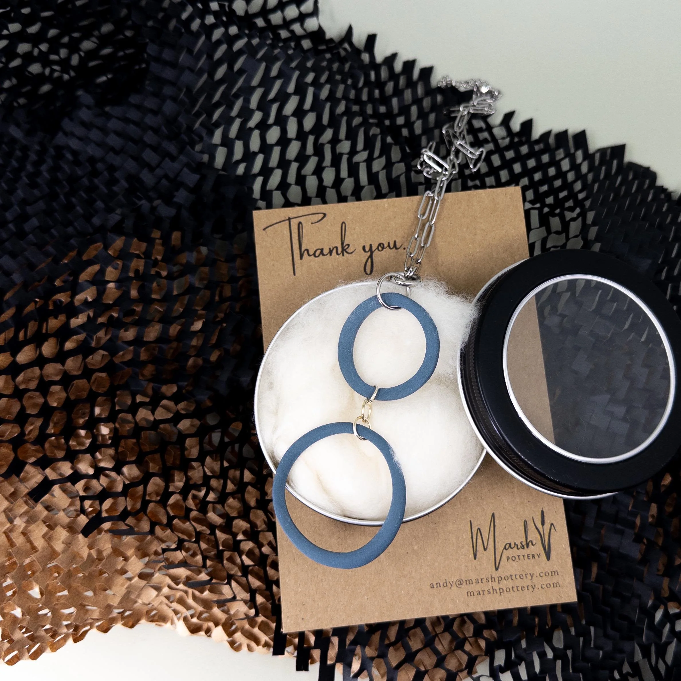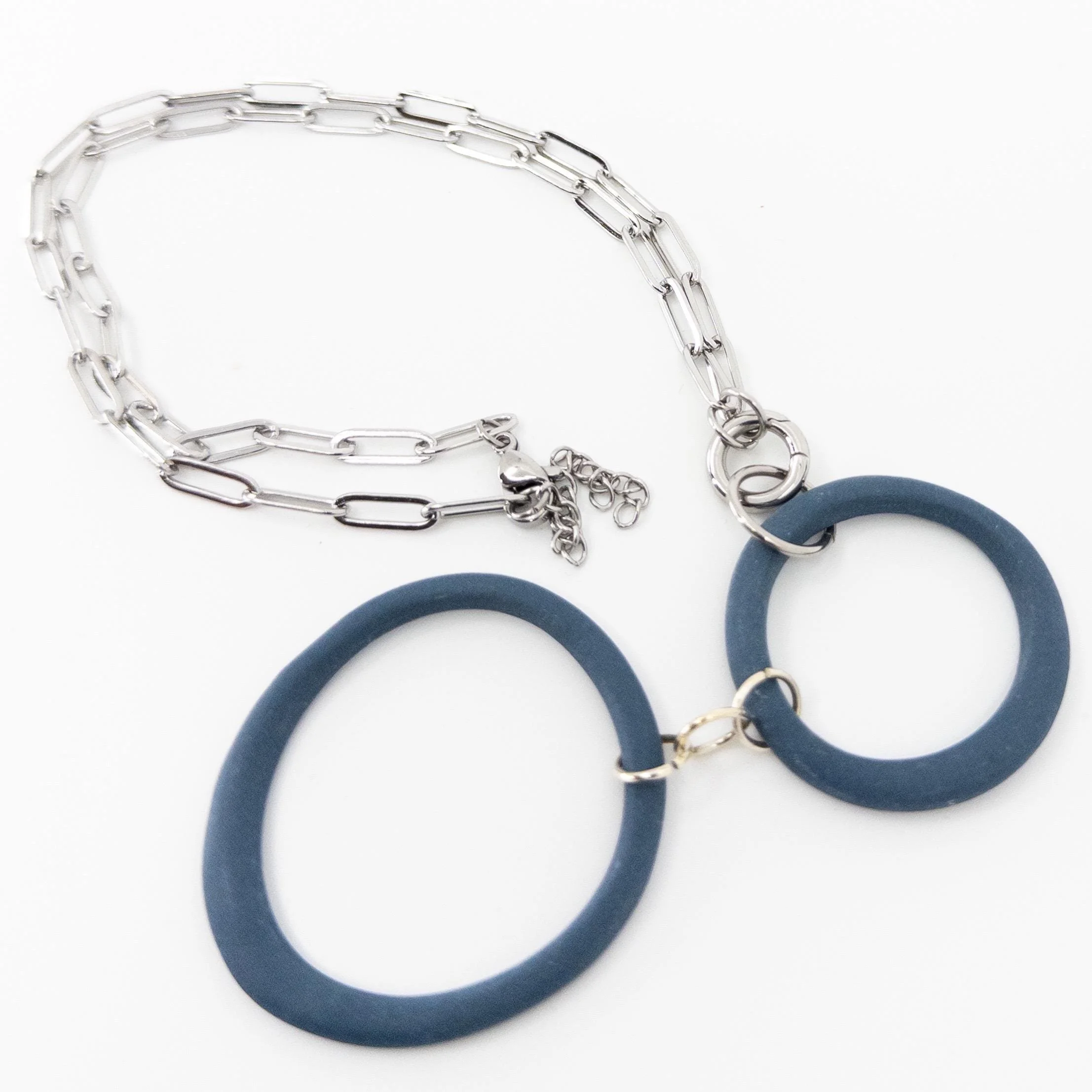 A contemporary statement piece, this necklace layers two porcelain circles of your choice in color. Suspended from a stainless steel paperclip chain, it’s bold yet elegant. Because they are handmade, each will be slightly different. Some will be made to order, so they might require two weeks production time.
