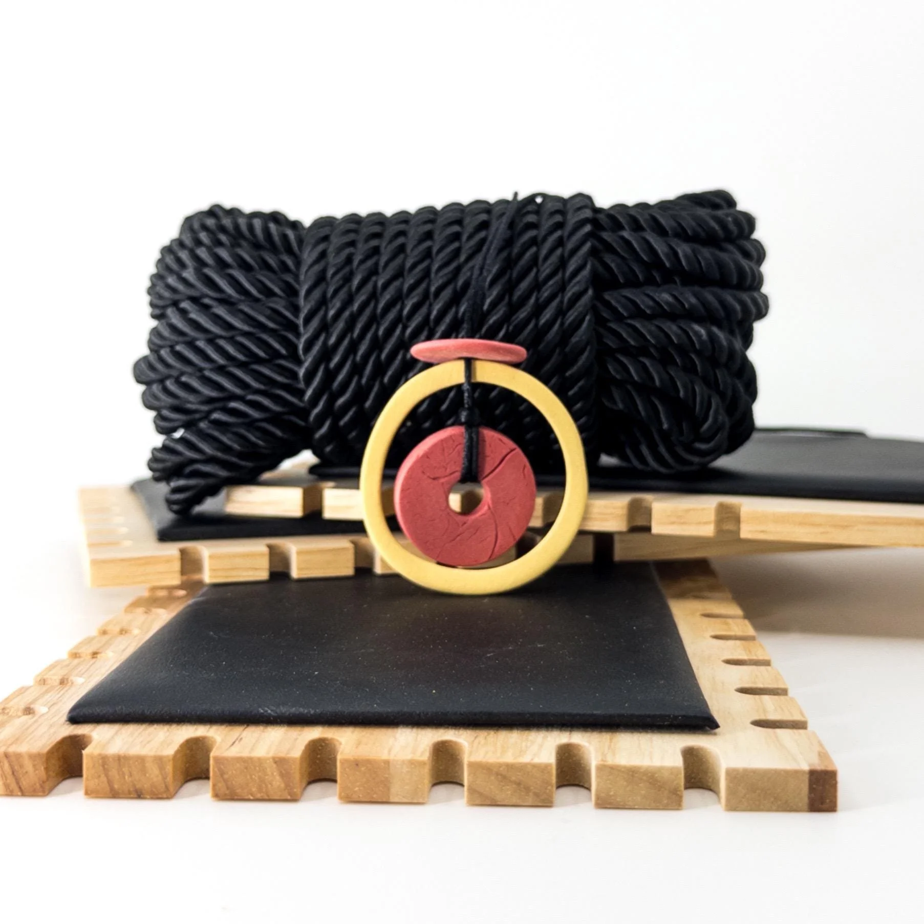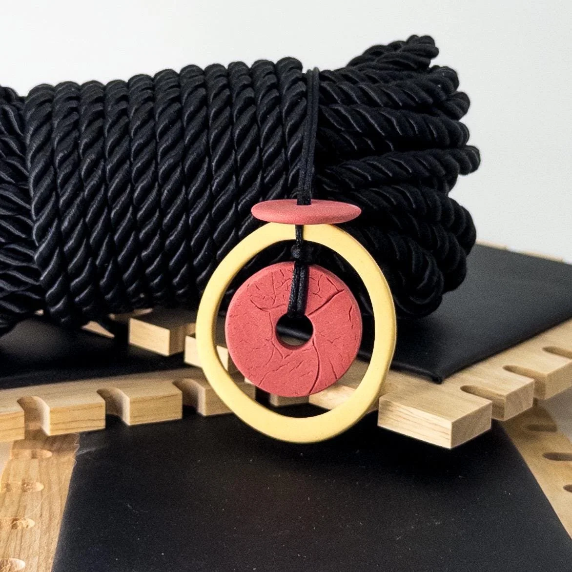 With subtle influences of Asian artistry, this red and yellow matte porcelain pendant combines a circle and discs to create a sculptural and textured design. Finished with a soft satin cord for comfortable wear.
