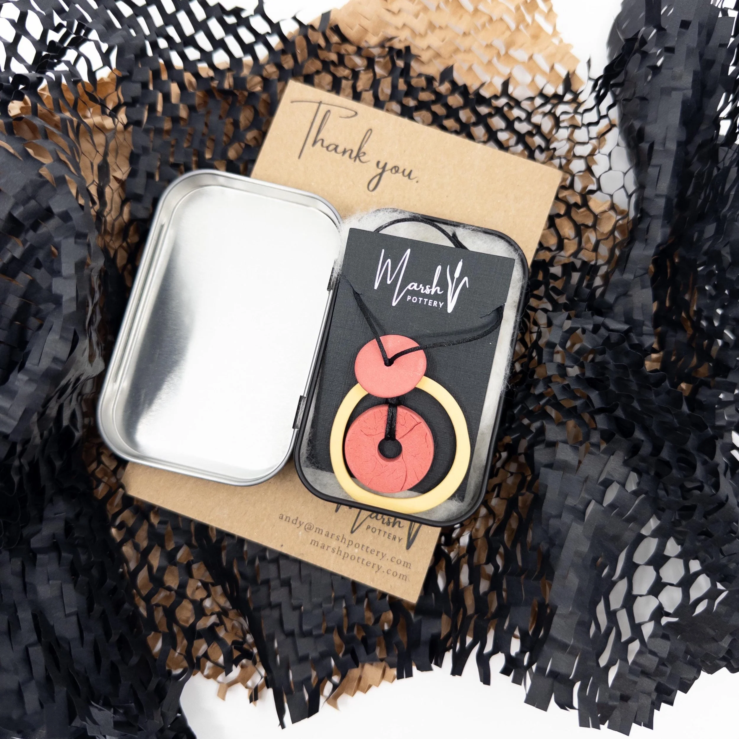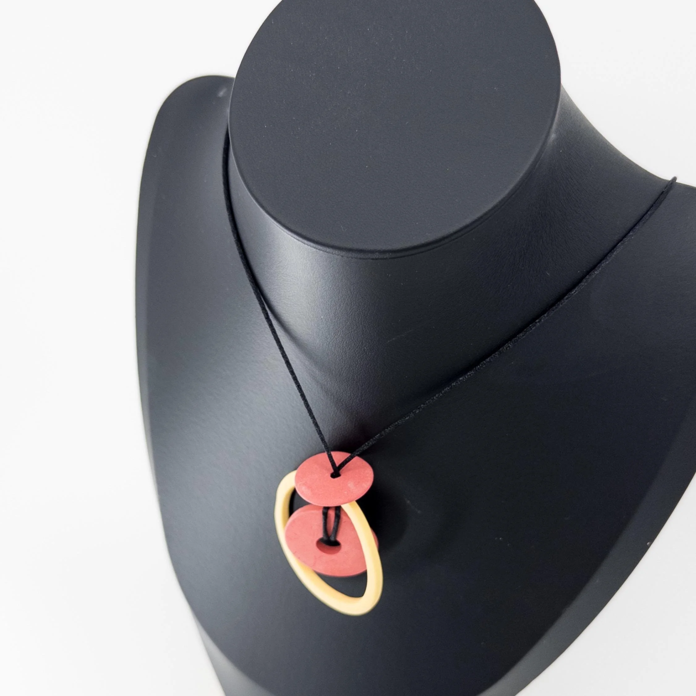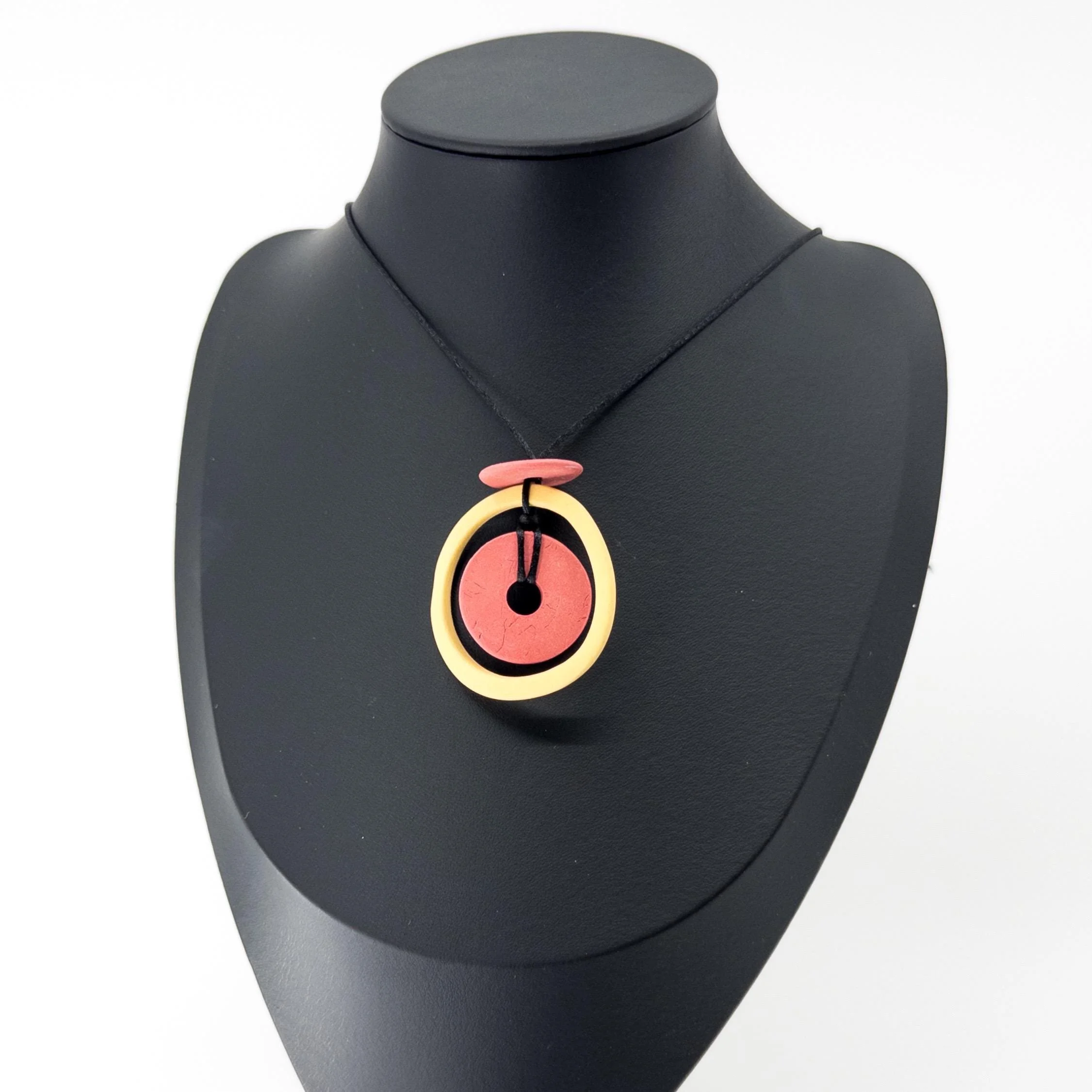 ONE OF A KIND - Red and Yellow Matte Porcelain Circle and Discs Pendant Necklace with Satin Cord
