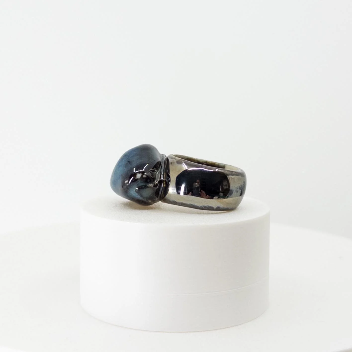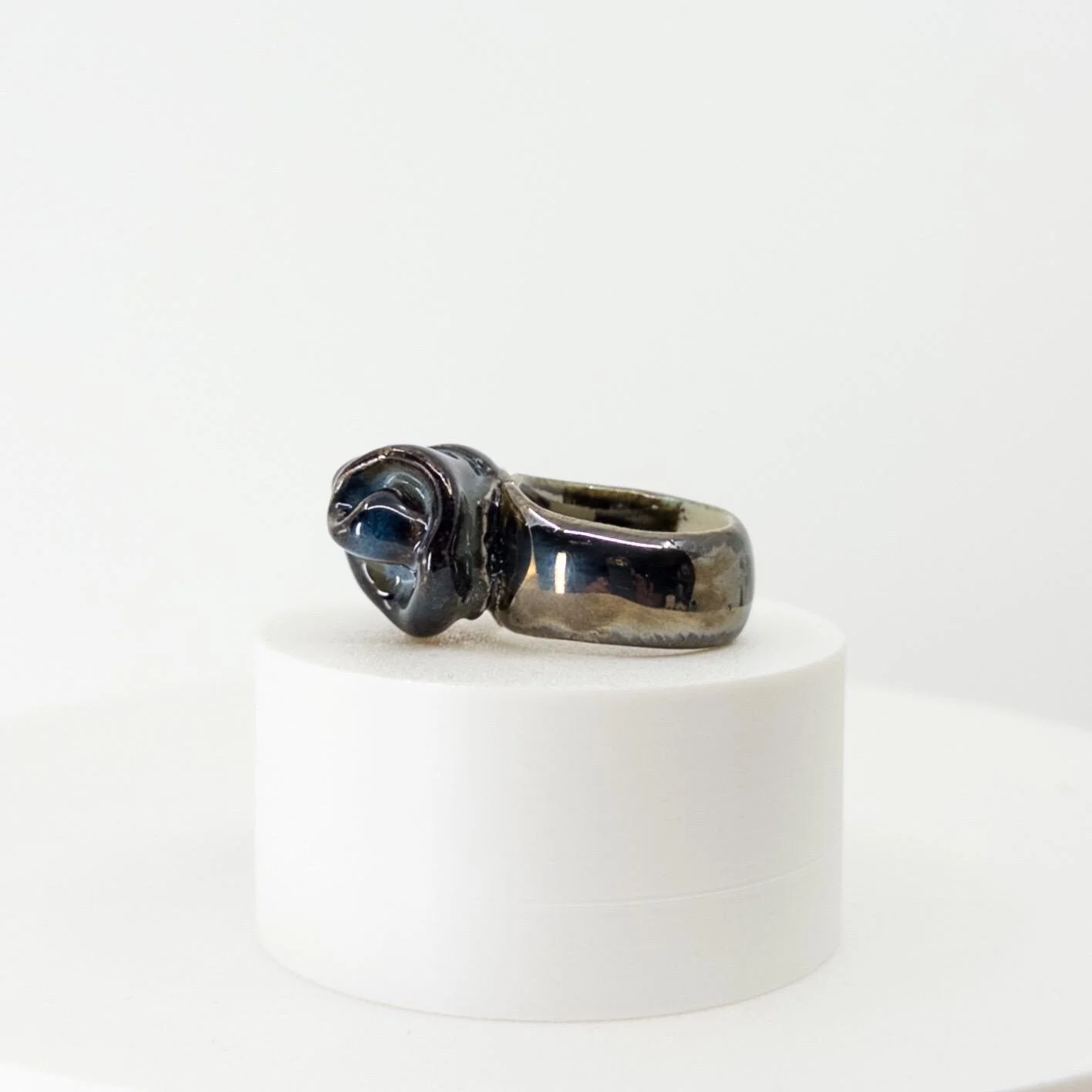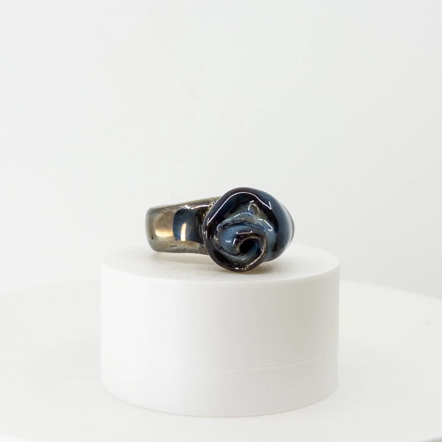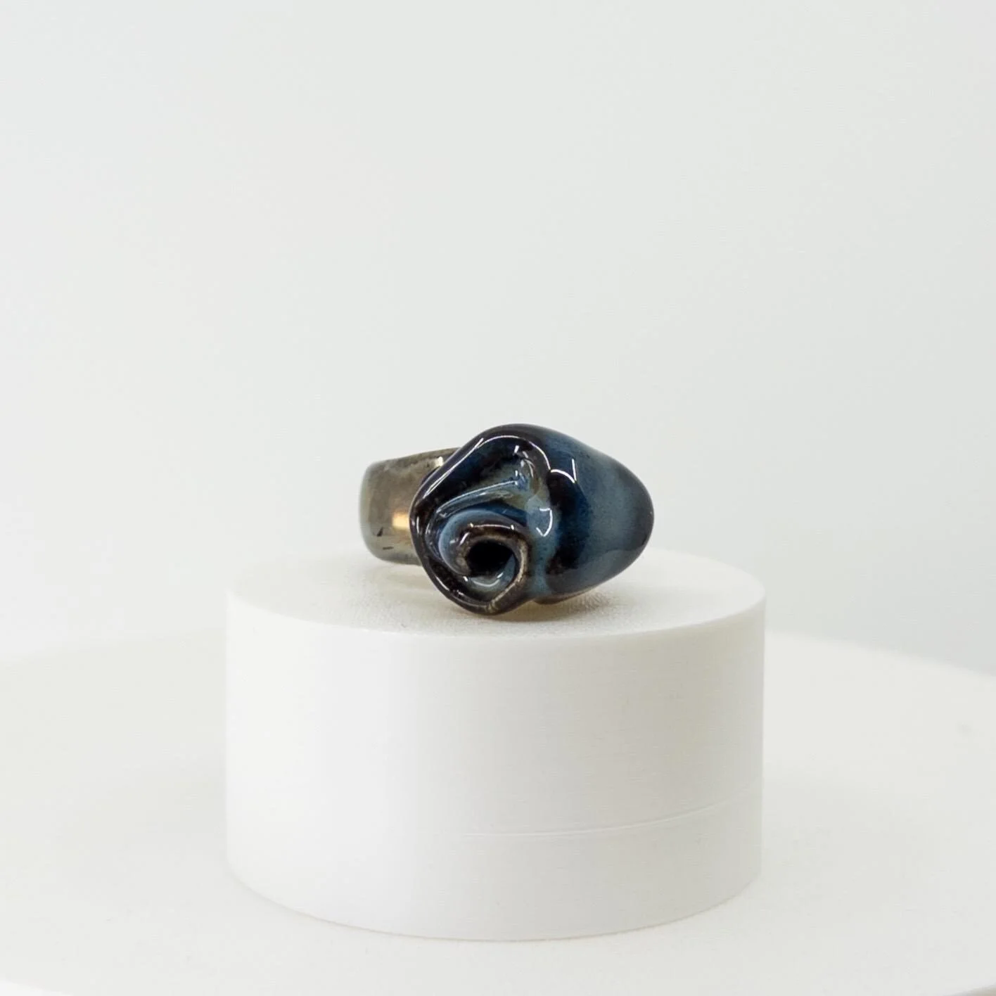 An enchanting blend of earthy and luxe, this porcelain ring features a sculpted flower bud adorned with a deep sapphire float glaze and a hint of metallic palladium. Unique, contemporary, and eye-catching.