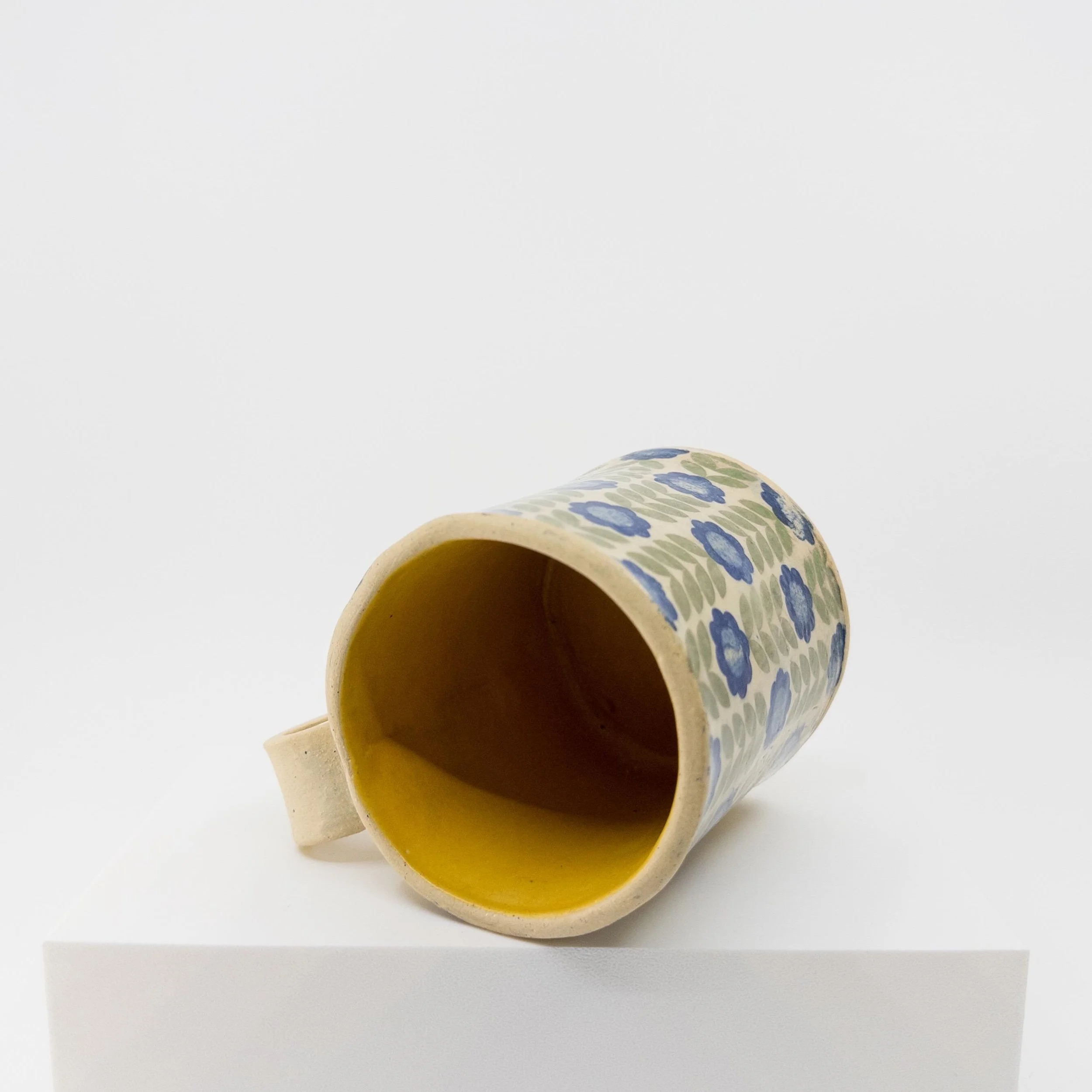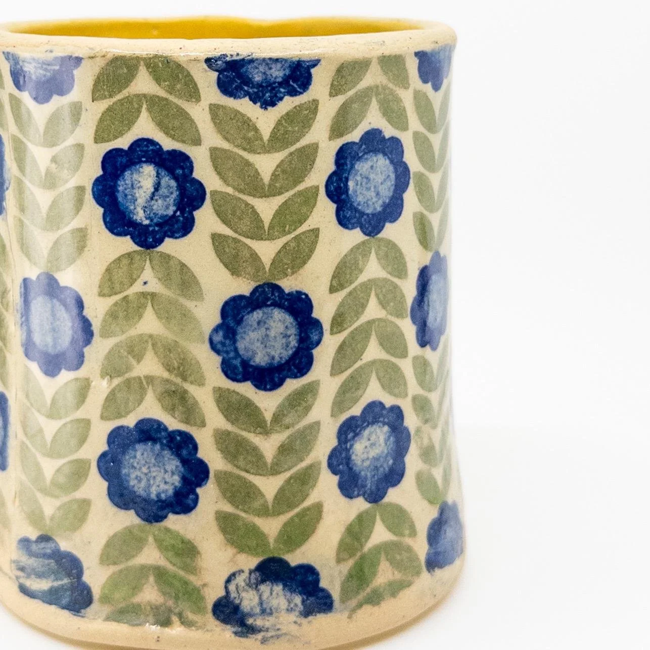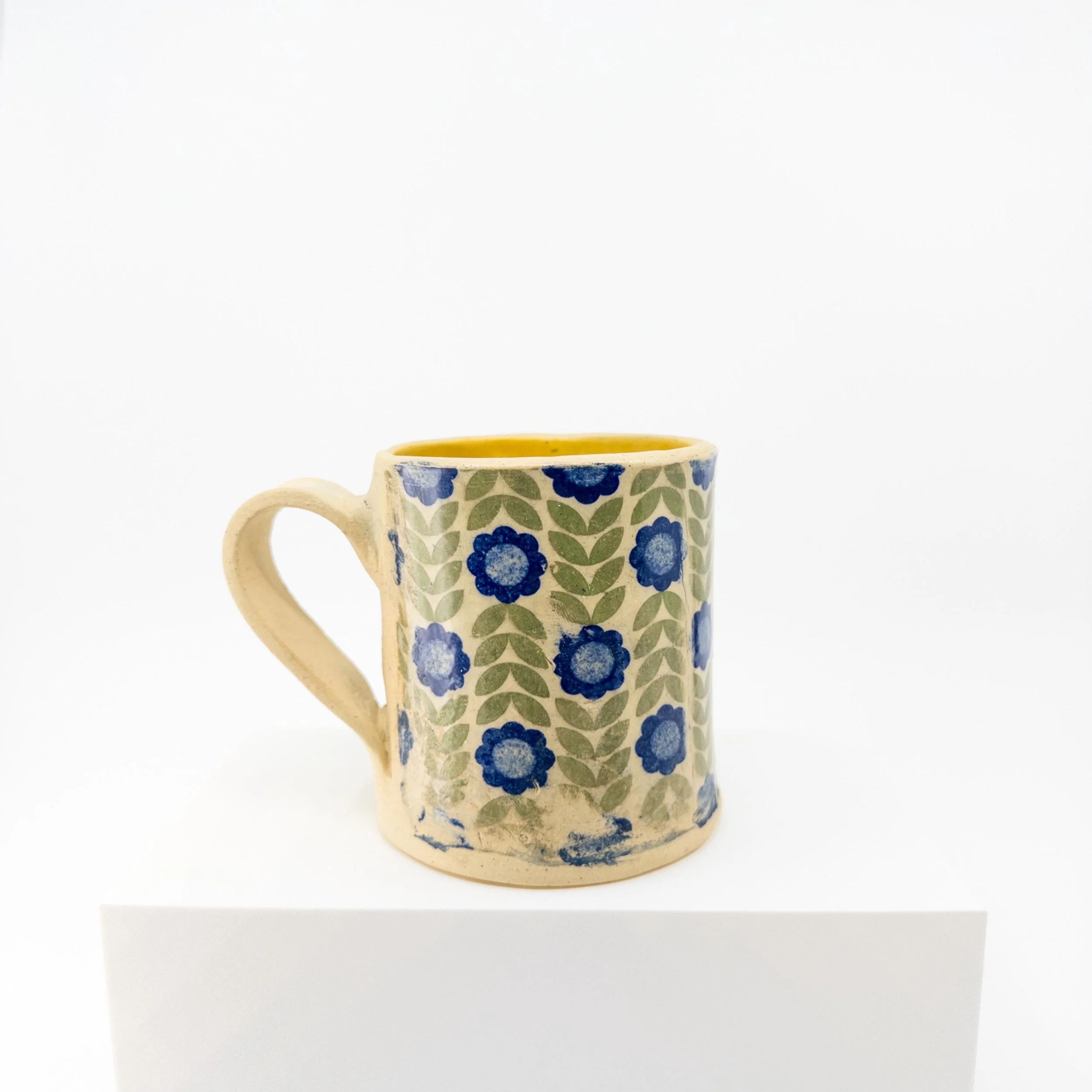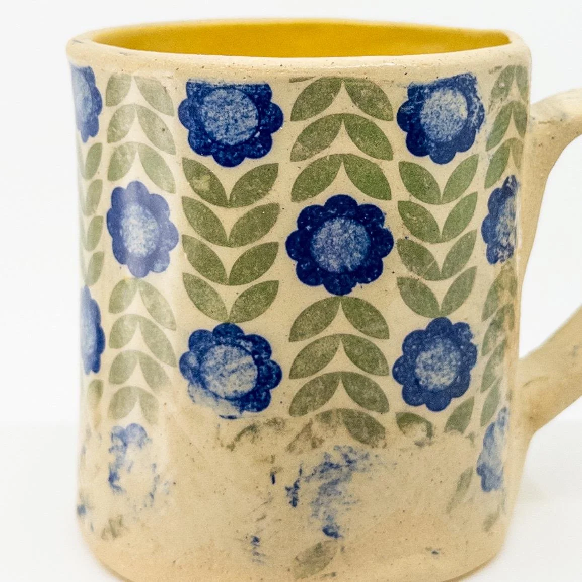 Bright and cheerful, this slab-built stoneware mug brings a touch of Scandinavian whimsy to your daily ritual. Hand-decorated with blue blossoms and green stems, each mug blossoms inside with a warm goldenrod glaze, while the lightly-glazed stoneware exterior offers a rustic, semi-gloss texture you’ll love holding onto. A balance of playfulness and earthiness in one perfectly sized drinking companion.
