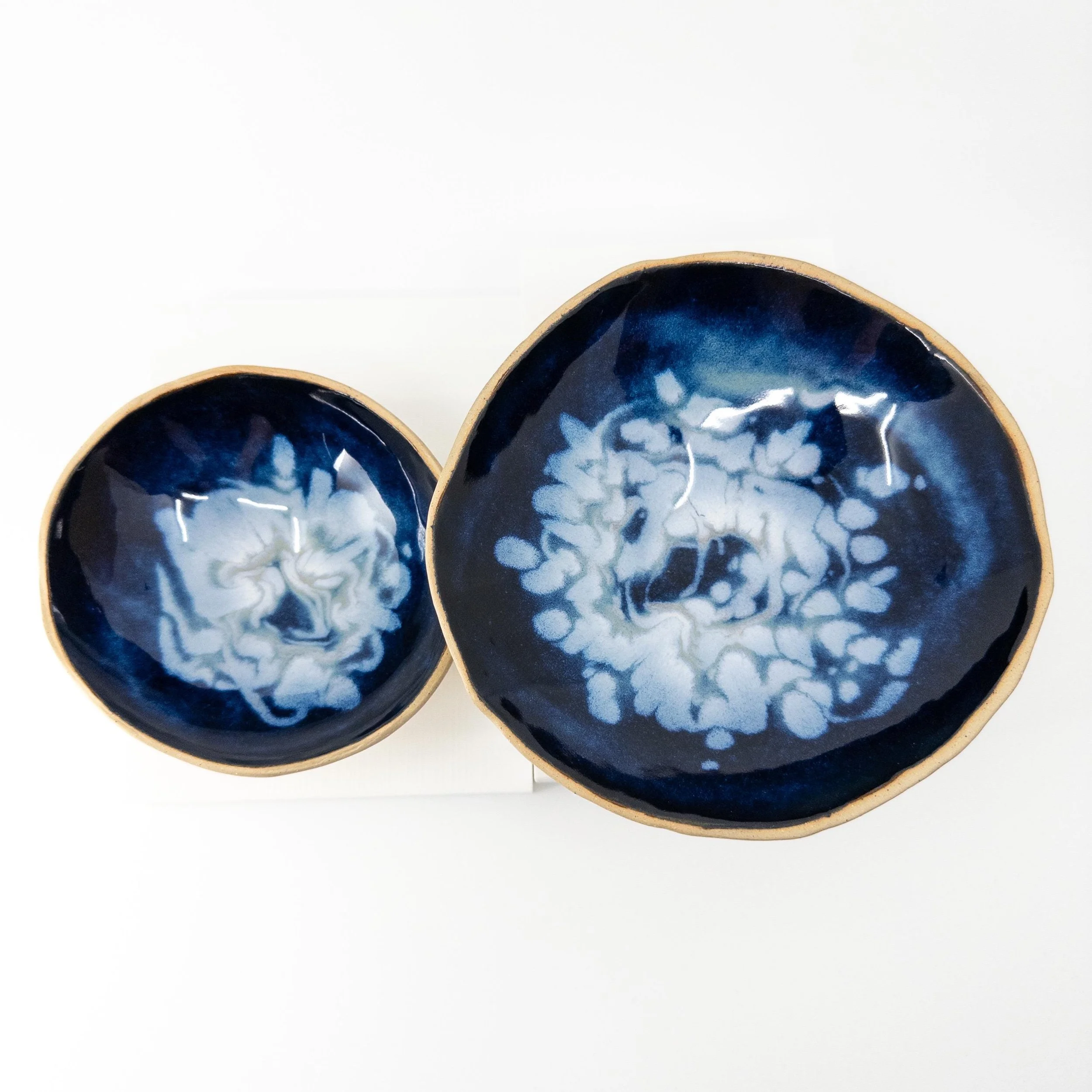 A striking set made for sharing, these two slab-built stoneware bowls play with contrast—smooth interiors glazed in swirling shades of blue, black, and gray, hidden within rugged stoneware exteriors. Sealed with liquid quartz for durability, they’re slightly irregular in shape, lending them a natural ovoid charm. Perfect for serving olives, nuts, fruit, or sweets, they bring an element of surprise to every gathering.