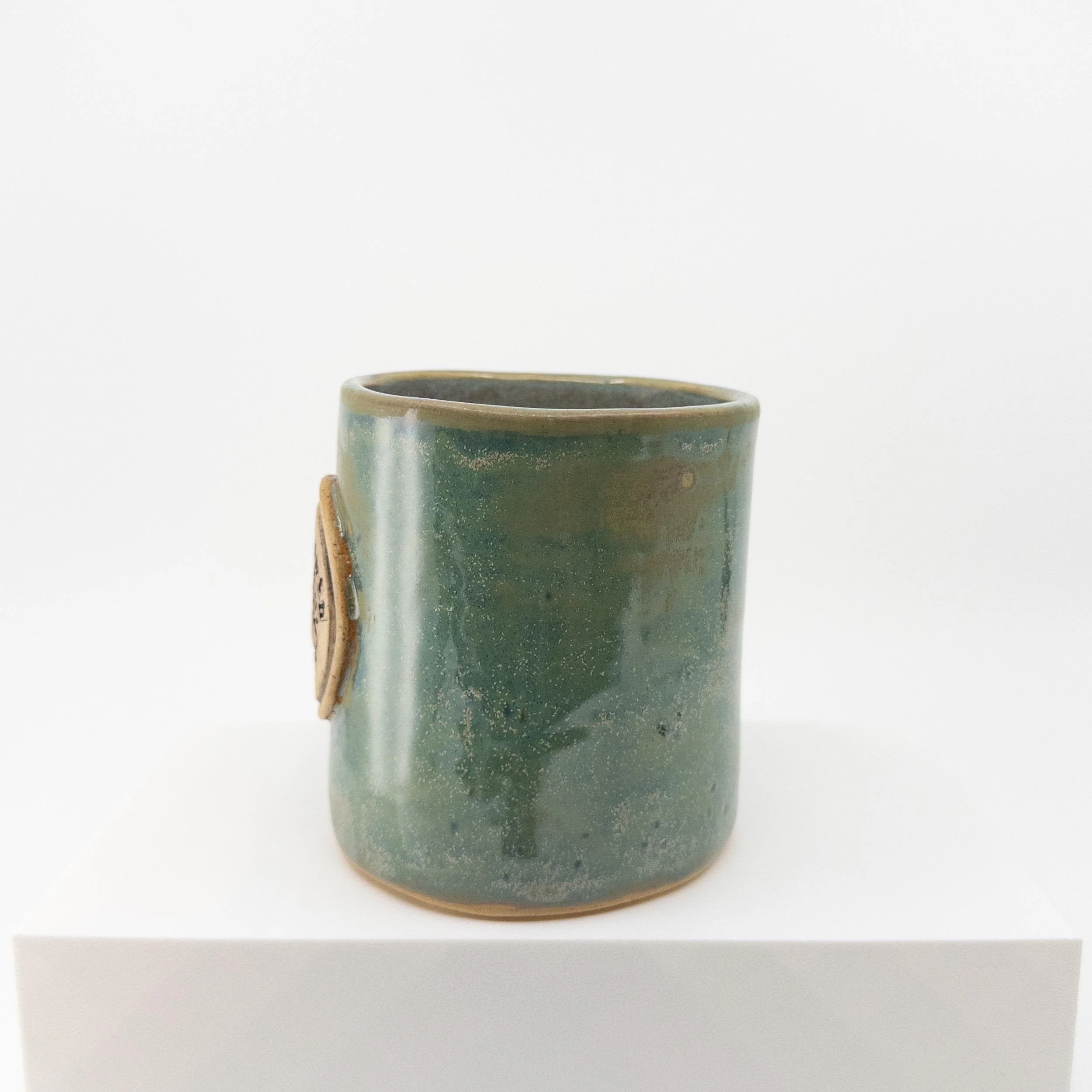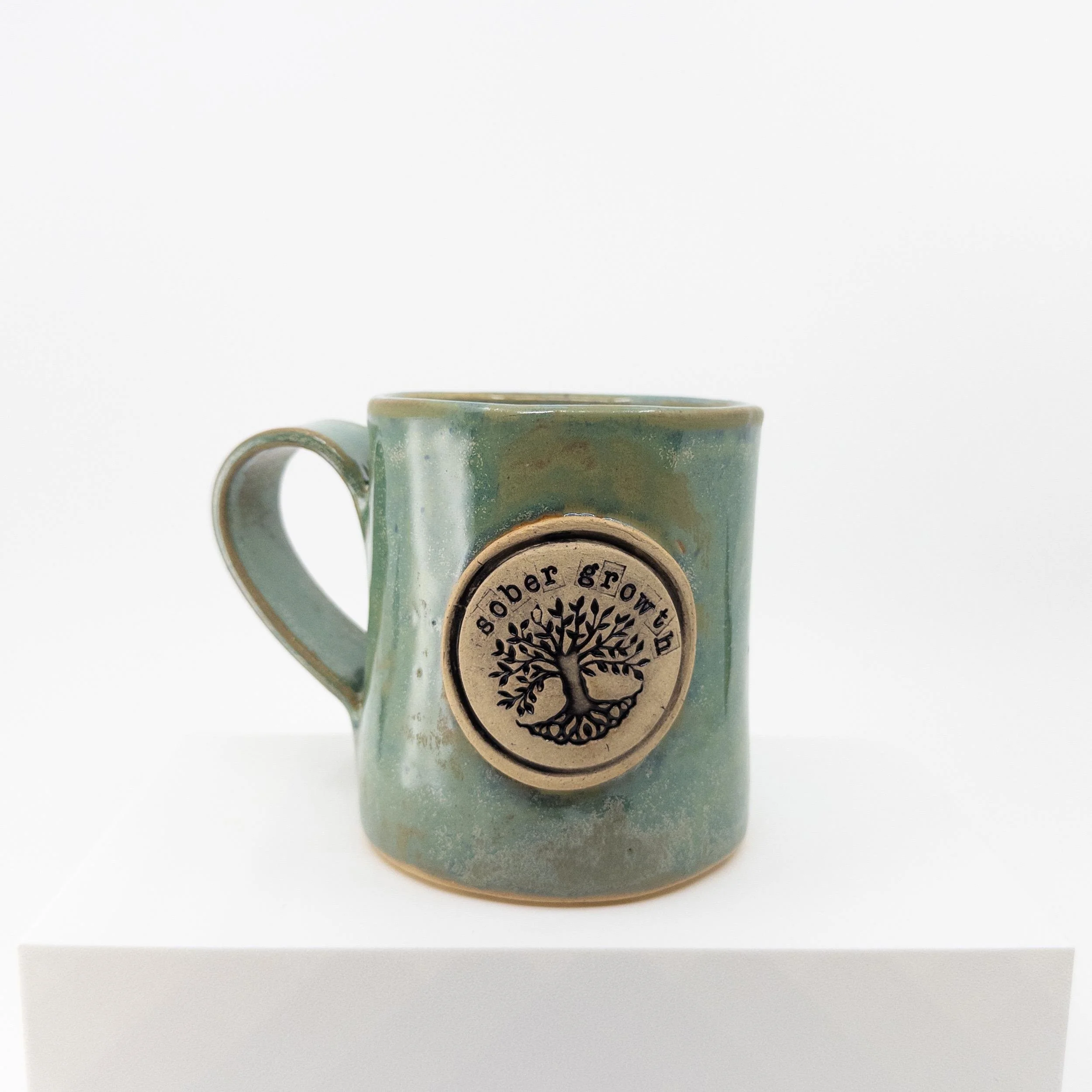 The very first in its line, this slab-built stoneware mug is both luminous and grounding. Glazed in a light, lustery aqua, it carries a raised Tree of Life badge on its side—symbolizing recovery, strength, and renewal. Those of us who have—or have had—difficulties with substances know that it’s hard to grow if we’re not sober. But once we are, we can grow both roots and branches.